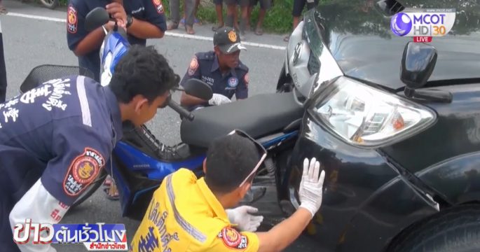 ตำรวจนครศรีธรรมราช เข้าตรวจสอบเหตุกระบะพุ่งชนท้ายรถจักรยานยนต์ คนขี่ร่างกระเด็นเสียชีวิต ส่วนคบขับกระบะหลบหนี