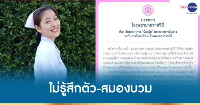 รพ.ราชวิถี อัปเดตอาการ “น้องอุ้ม” พยาบาลสาวอุ้มผาง บาดเจ็บสาหัสจากเหตุรถฉุกเฉินชนกับรถบรรทุกพ่วงในพื้นที่ อ.แม่สอด จ.ตาก หลังรับมารักษาตัวที่โรงพยาบาล ล่าสุดยังไม่รู้สึกตัว ใช้เครื่องช่วยหายใจ และมีอาการสมองบวม