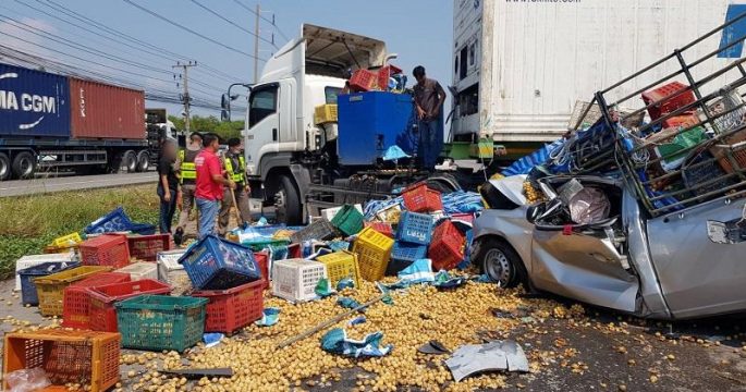 อุบัติเหตุถนนพระราม 2 สมุทรสาคร รถเทรลเลอร์เลี้ยวออกกะทันหัน รถกระบะเบรกไม่ทันชนเต็มแรงขณะขนลองกองใต้มาเต็มคันกระจายเกลื่อน กู้ภัยเร่งช่วย 3 ผู้บาดเจ็บส่งโรงพยาบาล