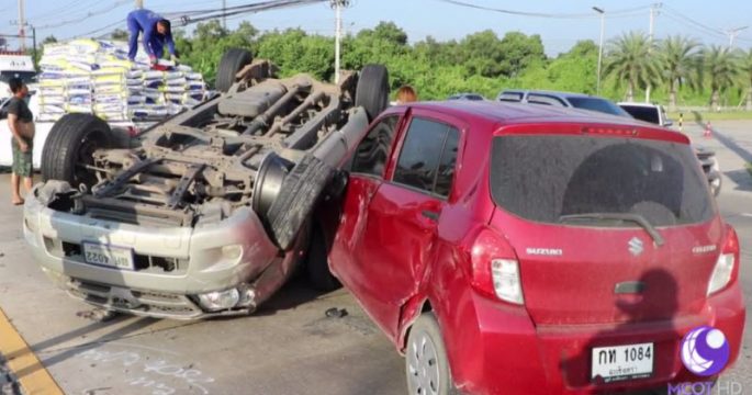 กระบะชนกัน 3 คันรวด เจ็บ 5 คน คาดฝนตกถนนลื่น