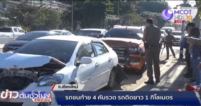อุบัติเหตุรถชนท้ายกัน 4 คันรวด บนถนนมหิดล กลางเมืองเชียงใหม่ มีผู้บาดเจ็บ 1 ราย การจราจรติดขัดเป็นระยะทางกว่า 1 กิโลเมตร