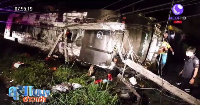 รถบัส พนง.เทศบาลดอนประดู่ศึกษาดูงาน ยางระเบิดตกถนนชนเสาไฟ เจ็บ 30 คน