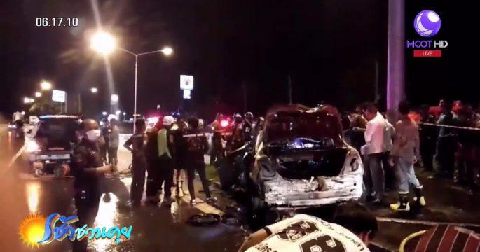 เก๋งซิ่งชนเสาไฟเกาะกลางถนน จ.นครปฐม ไฟลุกท่วม ดับ 2 ศพ