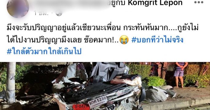 หนุ่มวัย 29 ปี ขี่รถจักรยานยนต์พร้อมเล่นมือถือไปด้วย ทำให้รถเสียหลักลงข้างทางและพุ่งชนเสาไฟฟ้า เสียชีวิตคาที่