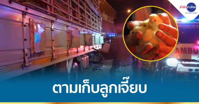 รถหกล้อบรรทุกลูกเจี๊ยบ 5,000 ตัว พุ่งชนท้ายรถพ่วง 18 ล้อ จอดข้างทาง เหตุเกิดเพราะคนขับก้มหยิบโทรศัพท์ เดือดร้อนกู้ภัยต้องตามเก็บลูกเจี๊ยบที่หล่นจากรถ