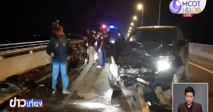 2 สามี-ภรรยา ขับรถกลับบ้านชนประสานงากลางสะพานที่กาญจนบุรีกับรถอีกคัน เสียชีวิตทั่งคู่ เจ้าหน้าที่ต้องใช้อุปกรณ์ตัดถ่างนำร่างไร้วิญญาณออกมาด้วยความลำบาก