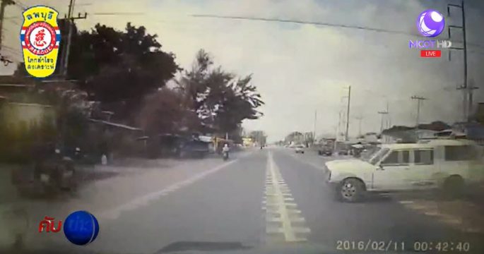 เจ้าอาวาสขับกระบะข้ามถนน ถูกกระบะอีกคันชนอย่างแรง รถเสียหลักหมุนไปฟาดกับรถจักรยานยนต์ ทำคนขี่จักรยานยนต์เสียชีวิต อ.โคกสำโรง จ.ลพบุรี