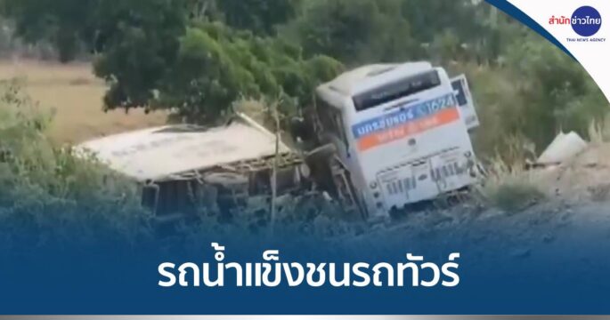 รถน้ำแข็งยางระเบิด เสียหลักชนรถทัวร์ตกข้างทาง ถนนสายโชคชัย-เดชอุดม พนักงานหญิงเสียชีวิตคาที่ ผู้โดยสารกว่า 30 ชีวิต ทุบกระจก รีบปีนออกประตูฉุกเฉิน เพราะมีกลิ่นน้ำมันรั่ว หวั่นไฟไหม้ มีผู้บาดเจ็บ 6 คน