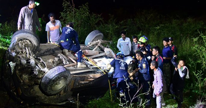 เกิดอุบัติเหตุเช้ามืดสะพานกงหรา-พัทลุง รถกระบะเสียหลักทางโค้งพุ่งชนเสาไฟฟ้าพลิกตกสะพานหงายท้อง พ่อ-ลูกเสียชีวิต และเจ็บอีก 1