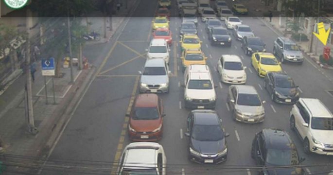 จราจรเช้าวันศุกร์ ถนนพหลโยธิน ขาเข้า มุ่งหน้าเข้าอนุสาวรีย์ชัยฯ รถติดขัด ถนนเพชรบุรี ยังเคลื่อนตัวได้เรื่อยๆ