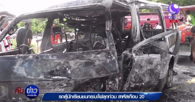 เกิดอุบัติเหตุรถตู้รับ-ส่ง นักเรียนชนประสานงากับรถกระบะ จนไฟลุกไหม้รถตู้นักเรียน เจ็บสาหัสเกือบ 20 ราย