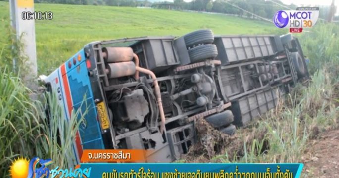 รถทัวร์โดยสารนครราชสีมา-กรุงเทพฯ วิ่งแซงซ้ายหนีรถติดบนถนนมิตรภาพ ล้อรถจมดินทำให้เสียหลักพลิกคว่ำตกข้างทาง ผู้โดยสารบาดเจ็บทั้งคัน 49 คน