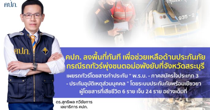 คปภ. ลงพื้นที่ทันที เพื่อช่วยเหลือด้านประกันภัย กรณีรถทัวร์พุ่งชนตอม่อพังยับที่ จ.สระบุรี พบรถทัวร์โดยสารทำประกัน “พ.ร.บ. – ภาคสมัครใจประเภท 3 – ประกันอุบัติเหตุส่วนบุคคล” โดยระบบประกันภัยพร้อมเยียวยาผู้โดยสารที่เสียชีวิต 6 ราย เจ็บ 24 ราย อย่างเต็มที่