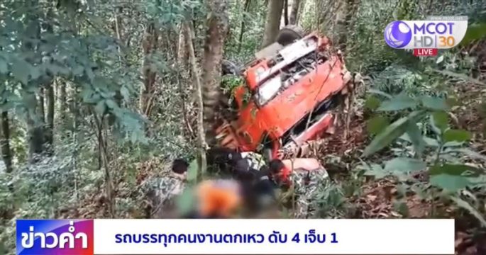 ฝนตกหนักถนนลื่น ทำให้เกิดอุบัติเหตุรถสี่ล้อเล็กบรรทุกคนงานของกรมชลประทาน แหกโค้งตกเหวลึก 50 เมตร ที่ จ.ตาก มีผู้เสียชีวิตทันที 4 ศพ เจ็บสาหัส 1 คน