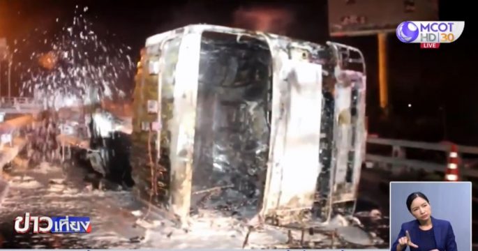 รถบรรทุกน้ำมันคว่ำถนนพหลฯ วังน้อย น้ำมันรั่ว-ไฟลุกท่วม