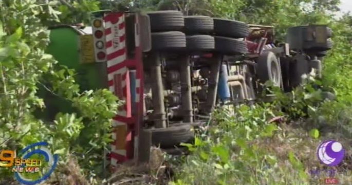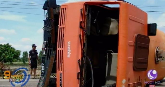 รถพ่วงบรรทุกน้ำมัน 38,000 ลิตร พลิกคว่ำบนถนนมิตรภาพ อ.โนนสูง จ.นครราชสีมา ทำให้น้ำมันดีเซลรั่วไหลออกจากวาล์วถังน้ำมัน ขณะที่คนขับไม่ได้รับบาดเจ็บ