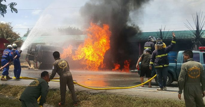ไฟไหม้รถเทรลเลอร์บรรทุกน้ำมันเบนซิน 50,000 ลิตร ในปั๊มน้ำมันริมถนน 304 ราชสีมา-กบินทร์บุรี เพลิงโหมรถวอดทั้งคัน และลามไหม้อาคารปั๊มน้ำมันเสียหายบางส่วน