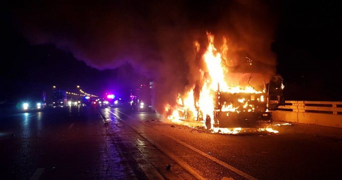 ระทึก! กลางสะพานข้ามคลองท่าแร้ง-สมุทรสาคร ไฟลามรถบรรทุกวอดทั้งคันขณะนำกุ้งสด 5 ตัน จะไปส่งตลาดทะเลไทย คนขับปลอดภัย คาดผ้าเบรกเริ่มมีปัญหามาตั้งแต่แยกวังมะนาวเสียดสีกับล้อจนลุกไหม้