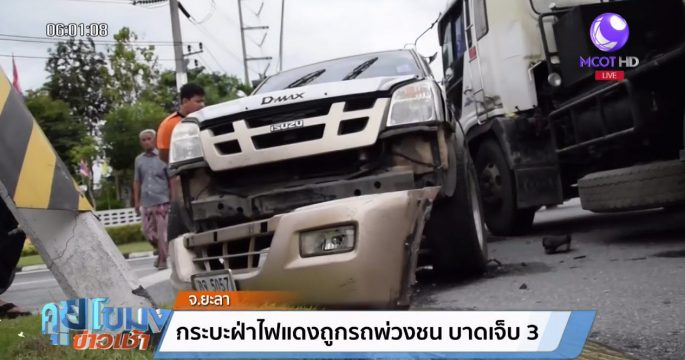 กระบะฝ่าไฟแดงสามแยกบ้านเนียง ถนนยะลา-บ้านเนียง อ.เมือง จ.ยะลา รถพ่วง 18 ล้อ เบรกไม่ทันพุ่งชนเต็มแรง บาดเจ็บสาหัส 3 ราย