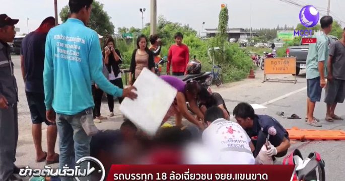 ตำรวจบางปะกง กู้ภัย และชาวบ้าน เร่งให้ความช่วยเหลือนายธันวา น้อนนารถ ที่ประสบอุบัติเหตุรถจักรยายนต์ชนรถ 18 ล้อ แขนขวาขาด เท้าขวาเกือบขาด นอนบาดเจ็บสาหัสอยู่บนถนน