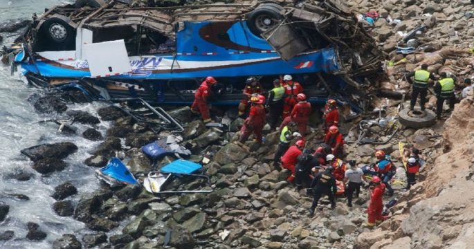 เกิดเหตุรถบัสชนประสานงากับรถบรรทุกบริเวณโค้งอันตรายในเปรู ก่อนตกหน้าผาริมทะเลคร่าชีวิตคนบนรถบัส 48 คน เพิ่มขึ้นจากที่แจ้งในตอนแรกว่าเสียชีวิต 36 คน