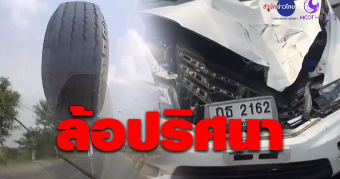 ล้อปริศนากลิ้งข้ามเลนพุ่งชนรถใส่ครูสาวพังยับ ทราบทีหลังเป็นของรถแก๊สที่ล้อหลุด เสียหลักลงข้างทาง
