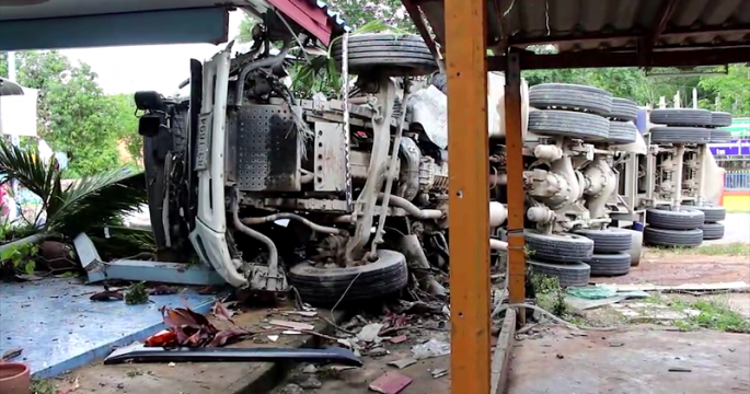 นาทีระทึก! เจ้าของบ้านเป็นลมหมดสติ ช็อกเหตุการณ์รถพ่วงบรรทุกหินคลุกพุ่งเข้าบ้านพังเสียหาย ส่วนคนขับบาดเจ็บ หลังเกิดอุบัติเหตุเฉี่ยวท้ายรถหกล้อบรรทุกน้ำดื่มบนถนนสายท่าตะเกียบ-ฉะเชิงเทรา