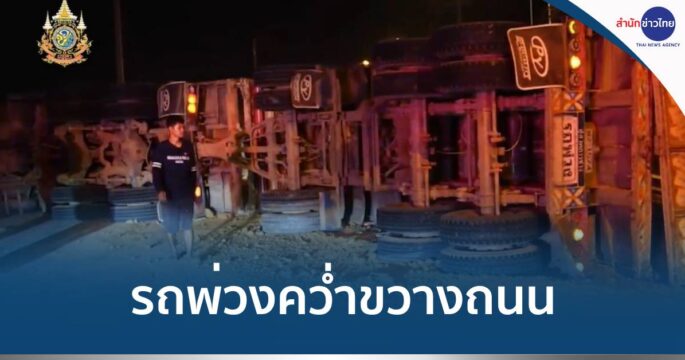 รถพ่วงพลิกคว่ำขวางถนน ปิดถนนเกือบ 3 ชั่วโมง