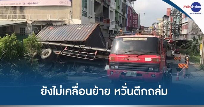 เจ้าหน้ายังไม่สามารถเคลื่อนย้ายได้ รถพ่วงบรรทุกตู้คอนเทนเนอร์ ที่เสียหลักไหลชนอาคารพาณิชย์ ย่านสะพานกรุงนนท์ หวั่นอาคารพังถล่มซ้ำ วางแผนนำอุปกรณ์ค้ำยันอาคาร ก่อนเร่งเคลื่อนย้ายภายในวันนี้