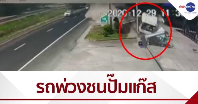 วงจรปิดวินาทีระทึก! รถพ่วงส่งของพุ่งชนซุ้มขายของกระจาย ก่อนทะลุเข้าปั๊มแก๊สชนเสาปูนป้ายไฟพังเสียหาย เคราะห์ดีไม่โดนหัวจ่าย