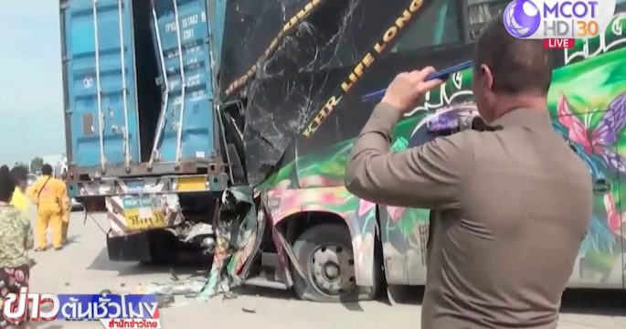 รถบัสรับส่งแรงงาน ในโรงงานในนิคมอุตสาหกรรมแหลมฉบัง ชนรถพ่วง 18 ล้อ บรรทุกตู้คอนเทนเนอร์ ที่จอดให้ทางรถที่กำลังกลับรถบริเวณถนนสายอินโดจีน มีผู้บาดเจ็บหลายราย