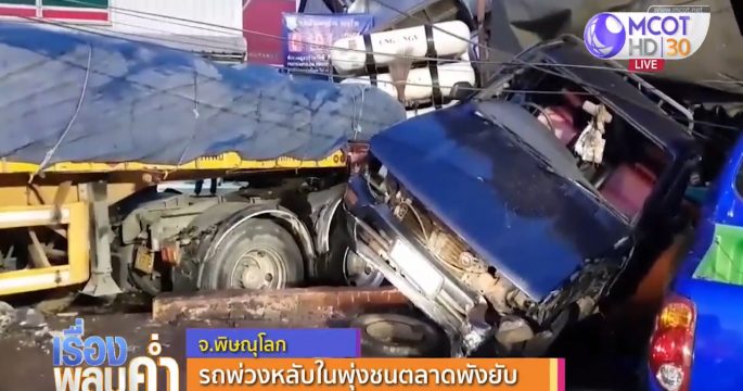 รถพ่วง 18 ล้อ เสียหลักพุ่งชนตลาดพังยับ มีผู้เสียชีวิต 1 ราย บาดเจ็บ 1 ราย รถเสียหาย 11 คัน เสาไฟฟ้าหักโค่นหลายต้น คาดคนขับหลับใน