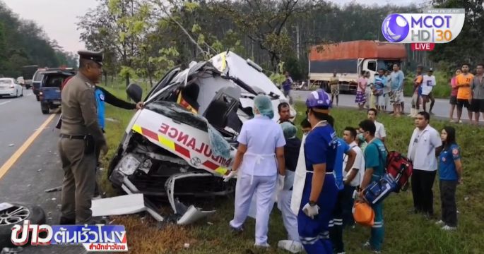 รถพยาบาลกลับจากส่งผู้ป่วยที่ภูเก็ต พุ่งชนท้ายรถพ่วง 22 ล้อ สภาพพังยับเยิน ทำให้ผู้ช่วยพยาบาลเสียชีวิต 1 ราย บาดเจ็บอีก 2 สาเหตุคาดว่า คนขับวูบหลับใน