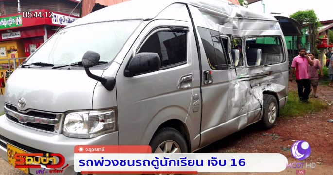 รถบรรทุกพ่วงชนรถตู้รับส่งนักเรียน บริเวณถนนบ้านผือ-น้ำโสม จ.อุดรธานี บาดเจ็บ 16 คน อาการสาหัส 2 คน คนขับรถบรรทุกอ้างถูกตัดหน้ากะทันหัน ทำให้เบรกไม่ทัน