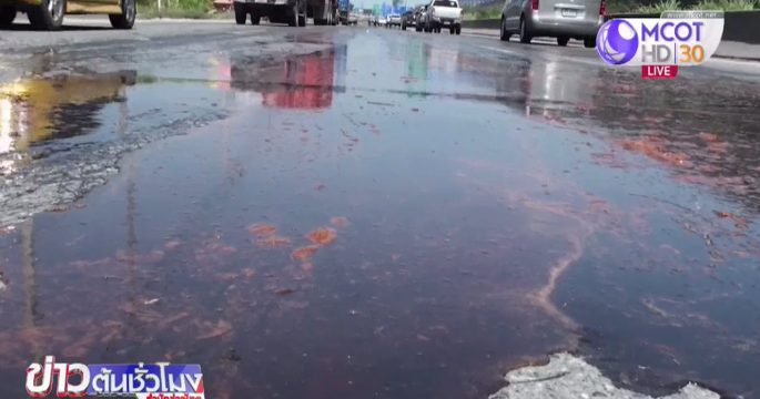 เกิดเหตุรถบรรทุกกากน้ำมันพืช ทำน้ำมันหกหล่นใส่พื้นถนนเส้นคู่ขนาน มุ่งหน้าเข้าแหลมฉบัง-ชลบุรี อ.ศรีราชา จังหวัดชลบุรี ทำให้รถที่ขับตามมาลื่นไถล มีผู้บาดเจ็บเล็กน้อย