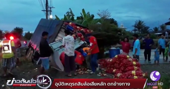 รถสิบล้อบรรทุกหอมหัวใหญ่เสียหลักตกร่องน้ำข้างทาง ชนอัดคันดิน ถ.เพชรเกษมฝั่งขาเข้า อ.กุยบุรี จ.ประจวบคีรีขันธ์ คนขับบาดเจ็บ 1 ราย หอมหัวใหญ่กระจายเกลื่อนถนน สาเหตุอยู่ระหว่างการสอบสวน