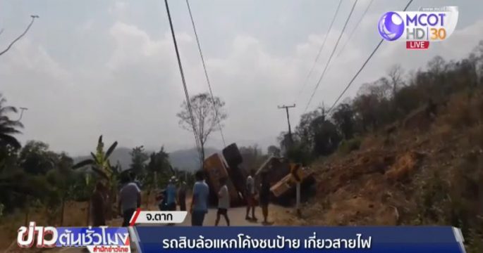 รถสิบล้อแหกโค้งชนป้ายทางหลวงและเกี่ยวสายไฟฟ้าขาดไฟดับทั้งหมู่บ้าน เหตุเกิดบนถนนติดแนวชายแดนไทย-เมียนมา บ้านช่องแคบ-ซอโอ อ.พบพระ จ.ตาก มีผู้บาดเจ็บ 2 คน ล่าสุดจ่ายกระแสไฟฟ้าและเปิดเส้นทางการจราจรได้ตามปกติแล้ว
