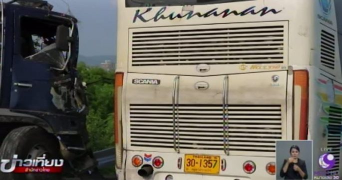 สิบล้อใส่เกียร์ค้างไหลเบียดร่างคนขับกับแบ็กโฮ