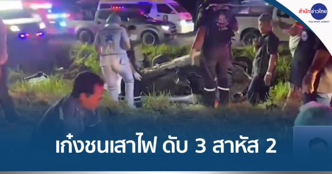 รถเก๋งชนเศษยางล้อรถบรรทุก 10 ล้อ บนถนน ก่อนเสียหลักพุ่งชนเสาไฟฟ้าส่องสว่างข้างทางพลิกคว่ำ เสียชีวิต 3 คน บาดเจ็บ 2 คน