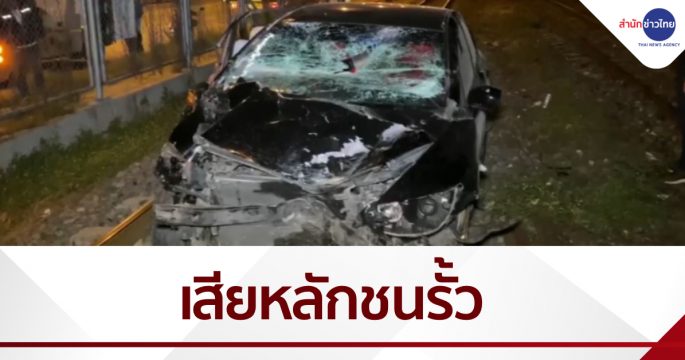 รถเก๋งถูกรถจักรยานยนต์ตัดหน้ากะทันหัน เสียหลักชนรั้วเหล็กริมทางรถไฟ ถนนกำแพงเพชร 6 ก่อนพุ่งไปจอดขวางทางรถไฟ สภาพหน้ารถพังยับเยิน กระจกหน้าแตกร้าว บาดเจ็บ 2 ราย