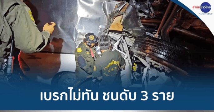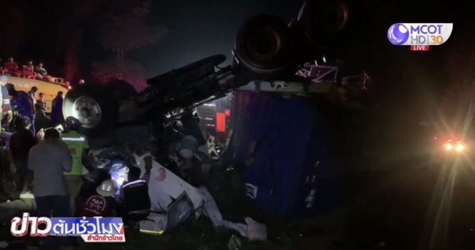 รถเทรลเลอร์ 18 ล้อ เฉี่ยวสิบล้อพลิกตะแคงกลางถนน ฟอร์จูนเนอร์ตามหลังมาเบรกไม่ทัน กระบะชนซ้ำ เสียชีวิต 3 คน