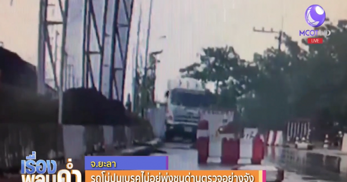 รถโม่ปูนเบรกไม่อยู่พุ่งชนด่านตรวจเสียหาย