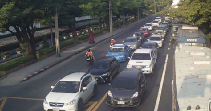 ถนนสามเสน ขาเข้า มุ่งหน้ามาทางแยกซังฮี้ เคลื่อนตัวได้ช้า ท้ายแถวสะสมอยู่ที่แยกวชิระ