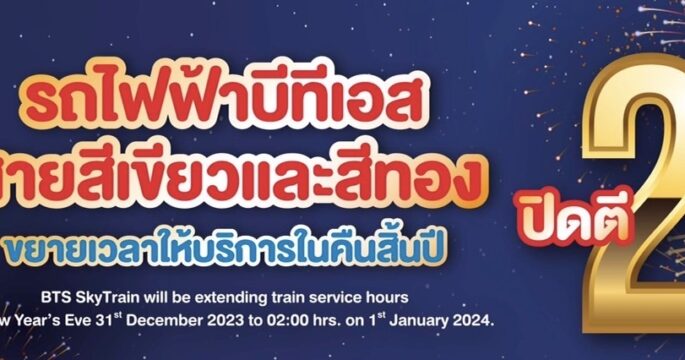 กรุงเทพ 19 ธ.ค.-ต้อนรับปีใหม่ 2567 รถไฟฟ้าบีทีเอส – สายสีทอง ขยายเวลาให้บริการถึงตี 2 ในคืนส่งท้ายปีเก่า