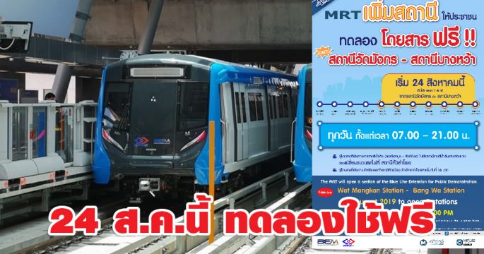 24 ส.ค.นี้ รฟม.-BEM เปิดให้ประชาชนทดลองใช้บริการรถไฟฟ้าสายสีน้ำเงินส่วนต่อขยายถึงสถานีบางหว้า