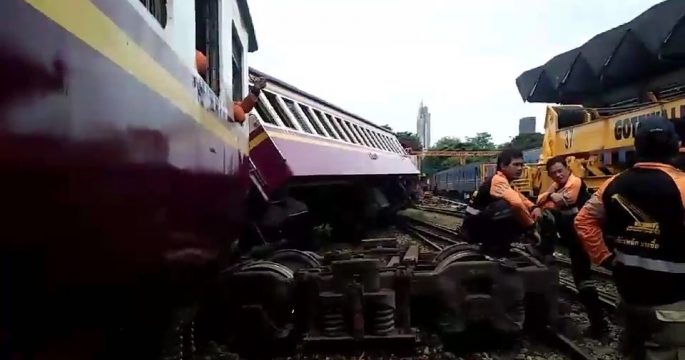 จนท.ระดมกำลังเคลื่อนย้ายโบกี้รถไฟสายแก่งคอย-กรุงเทพฯ ขาล่อง หลังพลิกตกราง 1 โบกี้ ที่สถานีรถไฟหัวลำโพงเบื้องต้นคาดเกิดจากช่วงสับราง