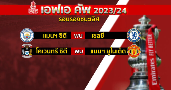 ผลการจับสลากประกบคู่ ฟุตบอล เอฟเอ คัพ รอบรองชนะเลิศ แมนฯ ซิตี้ พบ เชลซี ส่วน แมนฯ ยูไนเต็ด ที่ชนะ ลิเวอร์พูล 4-3 ในช่วงต่อเวลาพิเศษ จะพบ โคเวนทรี ซิตี้