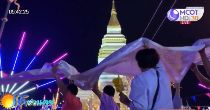 พุทธศาสนิกชนไทย-ลาว นับพันคน ร่วมกันห่มผ้าองค์พระธาตุกลางน้ำจำลอง ในเขตเทศบาลเมืองหนองคาย ส่วนที่วัดสระมรกต ต.โคกไทย อ.ศรีมโหสถ จ.ปราจีนบุรีประชาชนพร้อมใจกันนุ่งขาวห่มขาวเวียนเทียนรอบรอยพระพุทธบาทคู่ที่ใหญ่และเก่าแก่ที่สุดในประเทศไทย มีอายุกว่า 1,000 ปี