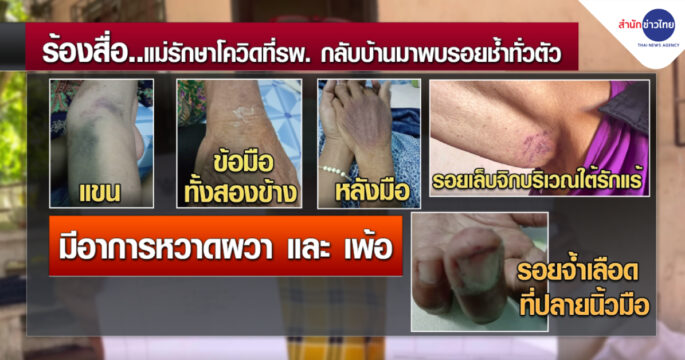ครอบครัวร้องสื่อฯ แม่ป่วยโควิด-19 เข้ารักษาที่ รพ. กลับบ้านมาพร้อมรอยช้ำทั้งตัว และมีอาการหวาดผวา ด้าน รพ.แจงรอยฟกช้ำเกิดจากการเจาะเลือด ยืนยันพยาบาลไม่ทำร้ายผู้ป่วย