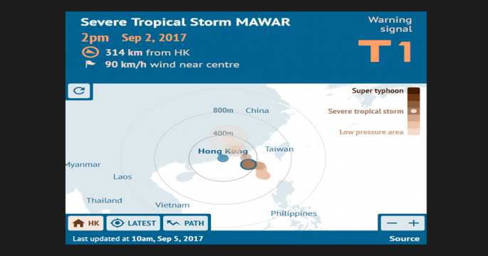 ฮ่องกงเตือนภัยระดับ 1 ซึ่งเป็นระดับเฝ้าระวังในวันนี้เนื่องจากพายุโซนร้อนมาวาร์กำลังเคลื่อนตัวมาใกล้ แต่คาดว่าไม่จะเผชิญพายุซ้ำเป็นลูกที่ 3 ในเวลา 2 สัปดาห์